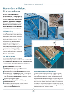 Im Bestand vorgeschrieben ist lediglich die im Vergleich günstige Dämmung der obersten Geschossdecke. Wer jedoch eine bestmög- liche Wärmedämmung erzielen möchte – beispielsweise, um eine kleinere Heizanlage zu installieren oder sich vor Hitze im Sommer zu schützen – kommt an der besonders effizienten Aufsparrendämmung kaum vorbei. Vor allem bei einer ohnehin vorgesehenen Dachneuein- deckung sollte diese Maßnahme in Betracht gezogen werden. Zumal sie keinerlei Auswirkung auf den Wohnraum im Dachgeschoss hat und zudem einen sehr guten Schallschutz bietet.