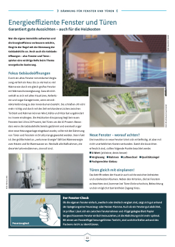 rekte Verbindung zu den Innenräumen besteht. Sie schließen oft nicht mehr richtig und durch mit der Zeit entstandene Lücken zwischen Türblatt und Rahmen können Wind, Kälte und Hitze fast ungehindert ins Innere eindringen. Die Heizkosten-Einsparung liegt bei neuen Fenstern bei 10 bis 20 Prozent, bei Türen um die 10 Prozent. Beson- ders wenn die Gebäudehülle bereits gedämmt und eventuell sogar eine neue Heizungsanlage eingebaut wurde, sollte mit der Dämmung von Türen und Fenstern nicht allzu lange gewartet werden. Denn Fakt ist: Der größte Anteil an „verlorener Energie“ fällt bei Wärmeenergie zum Heizen und für Warmwasser an. Weshalb alle Maßnahmen, die diese Verluste eindämmen, sinnvoll sind.
