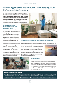 Wer den Entschluss zur Heizungssanierung gefasst hat, sucht diese meist sowohl nach ökologischen als auch ökonomischen Kriterien aus. Nicht zuletzt dank öffentlicher Fördermittel und geringerer Zusatzabgaben für CO2-Emissionen lohnen sich Heiz- systeme mit erneuerbaren Energien langfristig. Damit Sanie- rungsmaßnahmen und neue Heizanlage richtig zusammen- passen, ist eine fachliche Beratung unbedingt zu empfehlen.